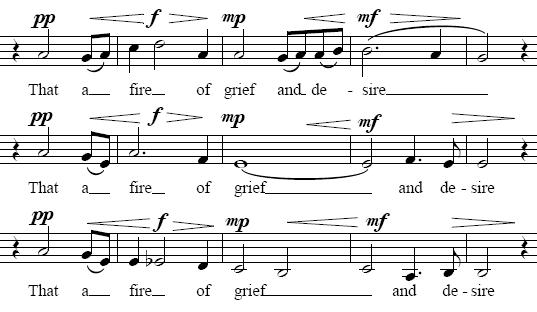 I like how a lot of the text seems to relate to the mechanism of singing. The line, “that a fire of grief of desire is scaling my throat and parching my voice” is especially suggestive of a musical concept. It made me want to make the main motive some sort of rising pattern that could easily be extended into a longer line that brings the text to life. So I wrote this melody: