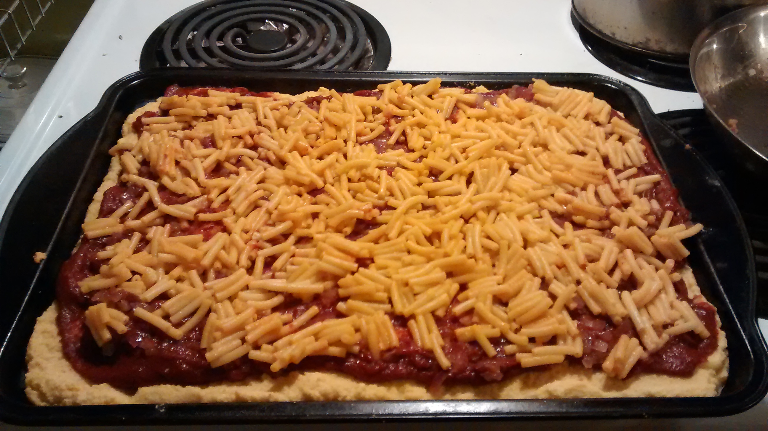 This evening, I embarked on a culinary experiment where I combine two of my favorite food vices: macaroni and cheese and pizza. I prefer not to self medicate with carbohydrates so I took steps to make sure I wouldn’t be experiencing my first open heart surgery at 35.