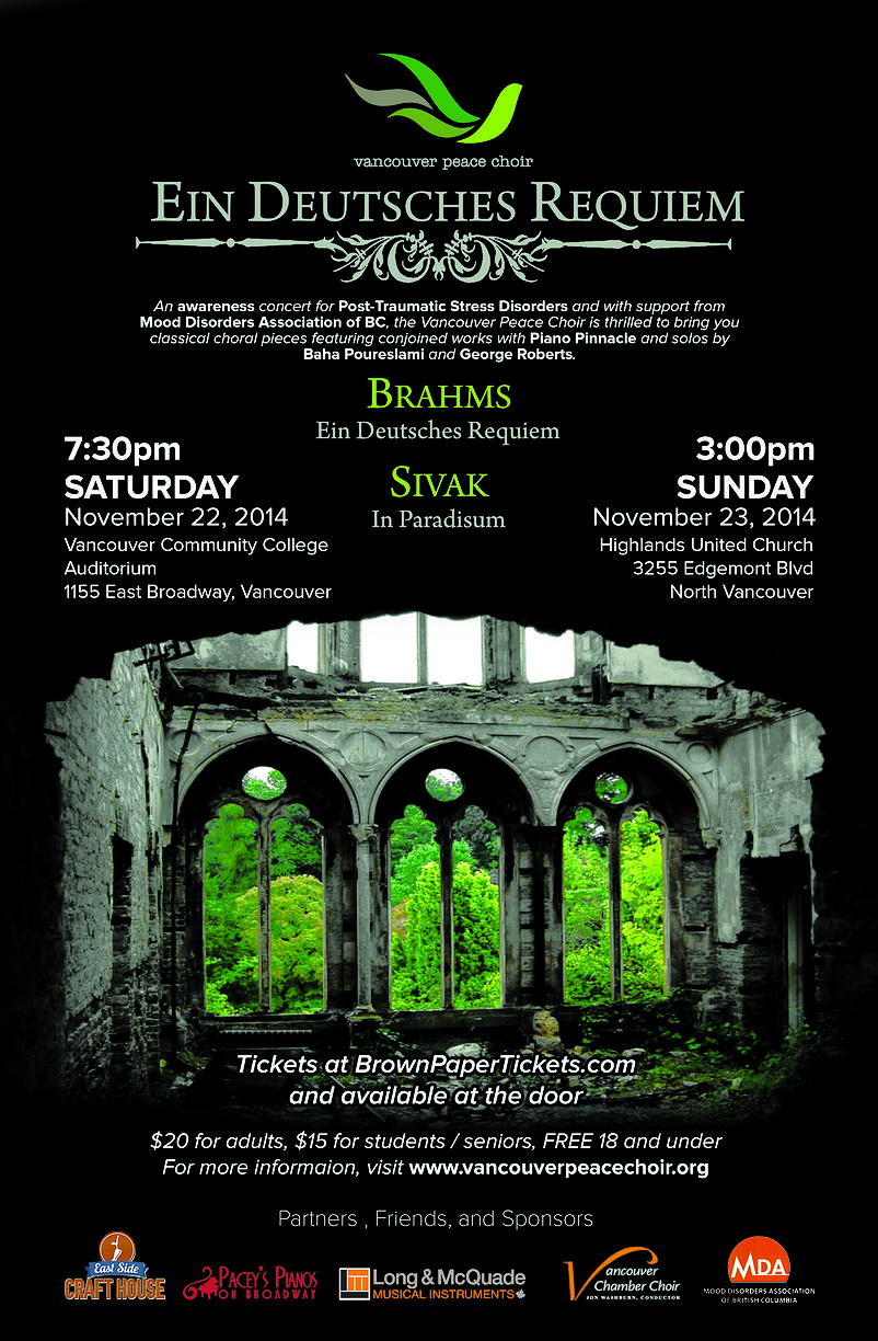 On the subject of harmonious creations, the Vancouver Peace Choir is performing my in paradisum setting next month. It’s a very ambitious piece that manages to incorporate a lot of what I love about the art of being able to write music down and definitely sets the bar for what I expect from myself artistically quite a bit higher. Note the proximity of my name to one of the heaviest of heavyweights in the canon on their poster: