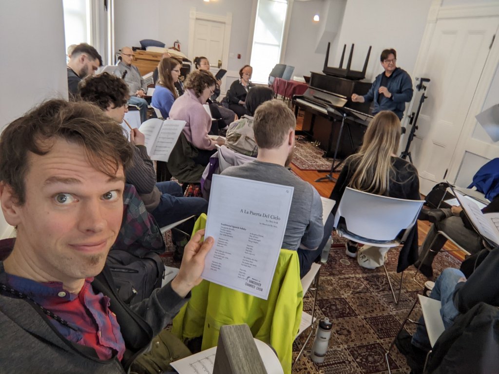Last week I once again had the privilege of hearing a piece of mine read at the Vancouver Chamber Choir’s Interplay workshop. I think this marks the fifth time I’ve attended (At one point I was referred to as one of, “the regulars”). The new piece is called, A La Puerta Del Cielo. It’s a setting of a Spanish lullaby / carol which marks the closest I’ve yet come to writing Christmas music. “Being in the choir business means being in the Christmas business” I was once told by a choral music publisher.